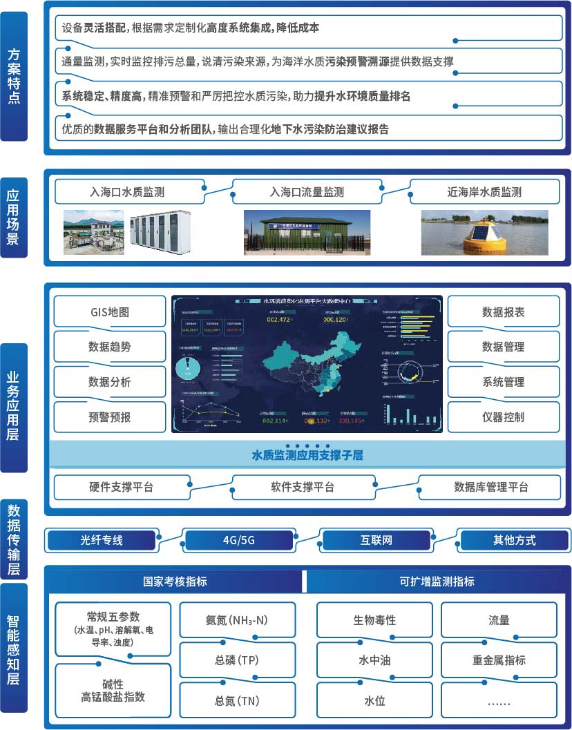 该系统可应用于近海海域、入海口等环境水质监测,可及时、准确地反映水质现状及变化趋势,为水体环境监测、预警、管理、规划等给予准确的实时数据。