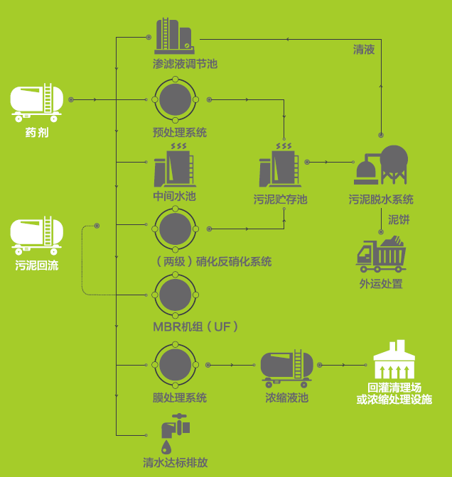 顺利获得提升泵将渗滤液输送至两级DTRO渗滤液处理设备处理,产水达到排放标准直接外排,浓缩液回灌至填埋场。