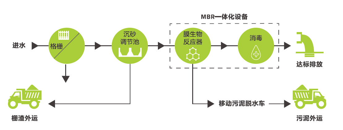 我司一体化设备采用A2O-MBR工艺,处理方法以生化为主,物理方法为辅。经由污水干管自流而来的污水第一时间顺利获得厂区格栅被拦截掉大粒径的悬浮物与漂浮物,然后流入调节池进行水质水量的调节,再经自清洗过滤器过滤后进入A2O-MBR污水处理站。一体化设备由厌氧池、缺氧池、好氧池和MBR膜组合而成,并集合紫外消毒管和电磁流量计,该装备主要去除有机物、氨氮、SS和磷。MBR出水达标排放,剩余污泥定期排入贮泥池,顺利获得移动污泥脱水车脱水处理后,泥饼进行填埋或绿化处置。